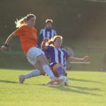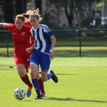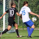 Wir starteten gleich mit Schwung nach vorne und hatten schon in der ersten Minute die erste Chance, die zur Ecke geklärt werden konnte. Gleich drei Ecken sollten direkt zu Beginn folgen, danach gab es allerdings Abstoß für die Gegner. In der Folge spiegeln unsere Spielnotizen den Verlauf sehr gut wieder: hoher Ball auf Meli- Abseits, Carina auf Meli – Abseits, Meli auf Charlotte – Abseits, verbesserungswürdig! Unsere Abwehr musste in der zehnten Minute das erste Mal eingreifen, Lisa konnte zur Ecke klären, die anschließend ebenfalls gut verteidigt wurde. Auch in der Folge versuchten wir immer wieder Steckpässe in die Gassen zu spielen, die jedoch meist nicht ankamen. Nach einer halben Stunde hatte Charlotte eine Schusschance, die jedoch vorbei ging. Ähnlich ging es Carina, die den Rückenwind bei ihrem Freistoß aus dem Halbfeld nicht eingerechnet hatte und den Ball übers Tor schoss. Fast im Gegenzug war unsere Abwehr wieder gefordert, konnte jedoch erfolgreich mehrere Schüsse blocken. Die letzten 15 Minuten der ersten Hälfte fanden eher im Mittelfeld statt, viele Zweikämpfe dominierten das Spielgeschehen, wirklich gute Torchancen gab es zwar nicht mehr für uns, aber auch nicht mehr für unsere Gegner. Allerdings schaltete Mona kurz vor dem Pausenpfiff nach einem Freistoß am schnellsten und schickte Meli, die den Ball gekonnt im Tor unterbrachte – die 1:0 Führung mit dem Halbzeitpfiff!